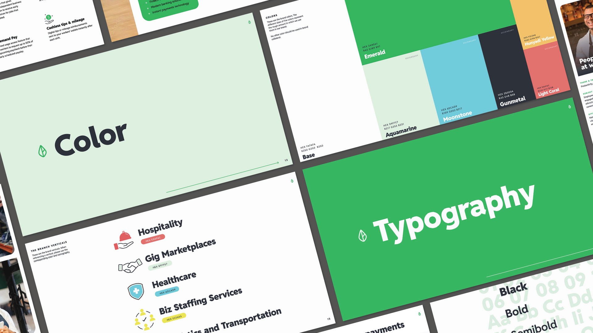 The refresh began with a manifesto-led approach that put people, not platforms, at the center of the story. From there, we built a visual identity system designed to feel confident, optimistic, and human. Bright, vibrant photography celebrates real workers. A flexible color system supports industry-specific storytelling. Clear, approachable typography reinforces clarity and trust. Every element of the system was designed to scale while staying grounded in one core truth: faster pay is a tool for empowerment, not just efficiency.